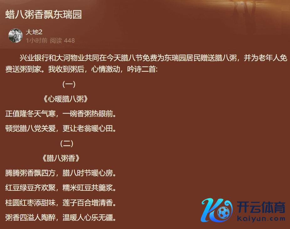 此外,大河物业和兴业银行康平路支行的责任主谈主员还惦记住集团的离退休老东谈主。在这个极端的日子里,他们提前统筹安排,挨个上门访问,为部分老东谈主送去了热热闹闹的腊八粥。当老东谈主们接过这份饱含关爱的腊八粥时,心中振奋言外之音,有的还就地吟诗二首。