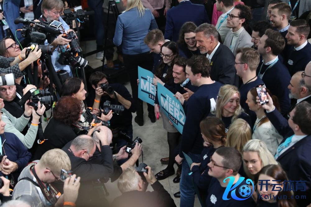 2月23日,在德国柏林的基督教民主定约总部,定约党总理候选东说念主默茨(中)在出口民调露馅擢升后秉承祝福。新华社记者杜哲宇摄